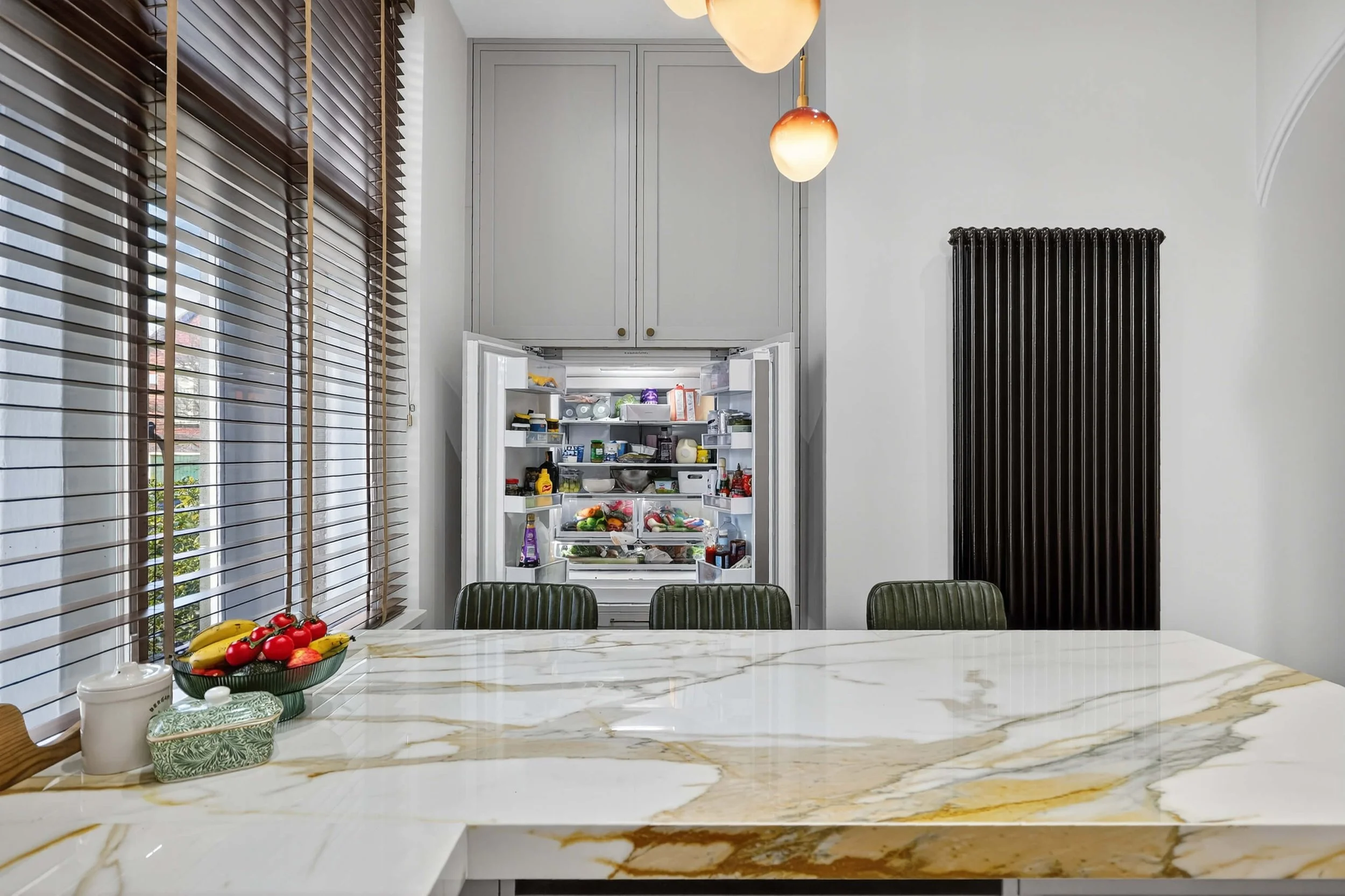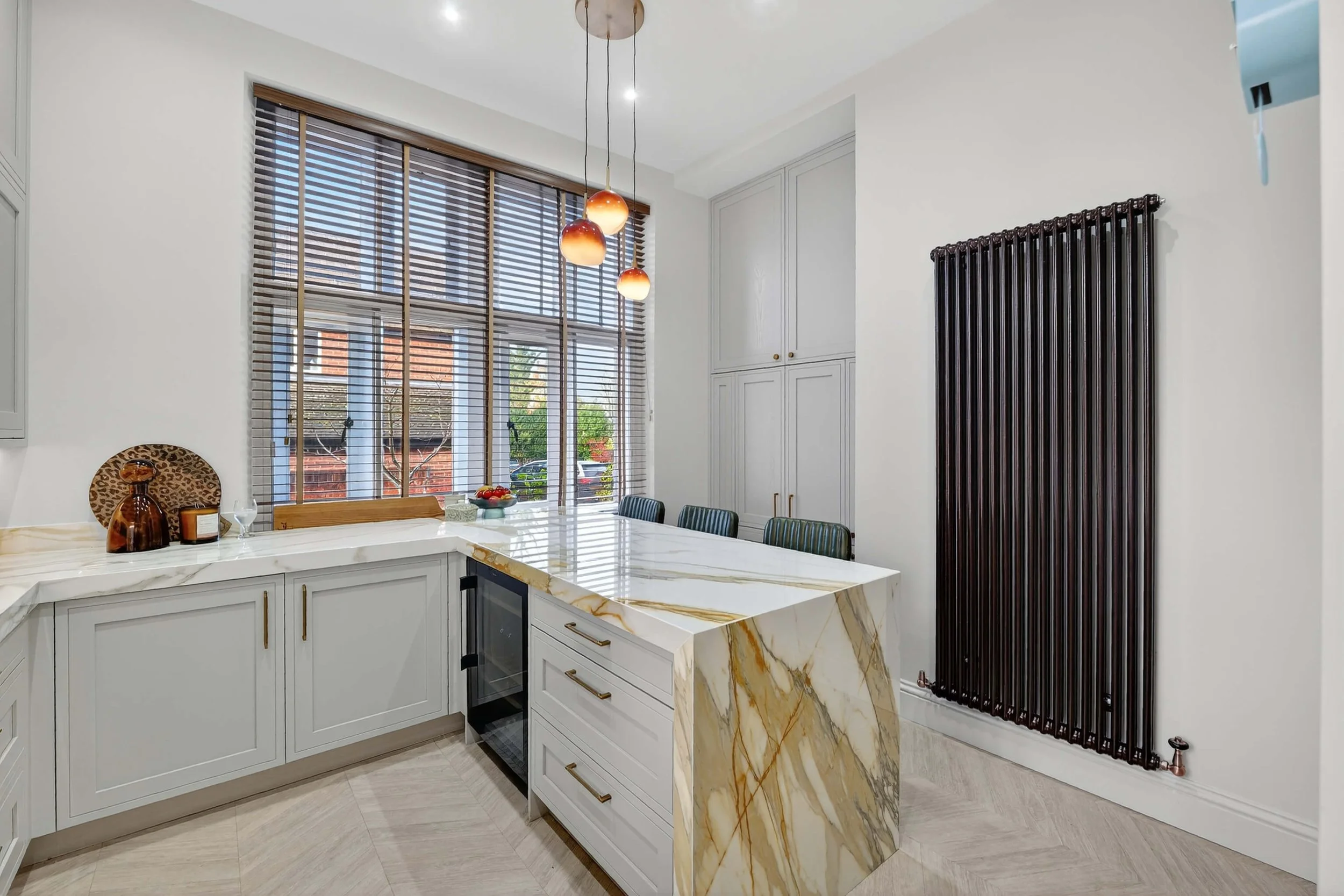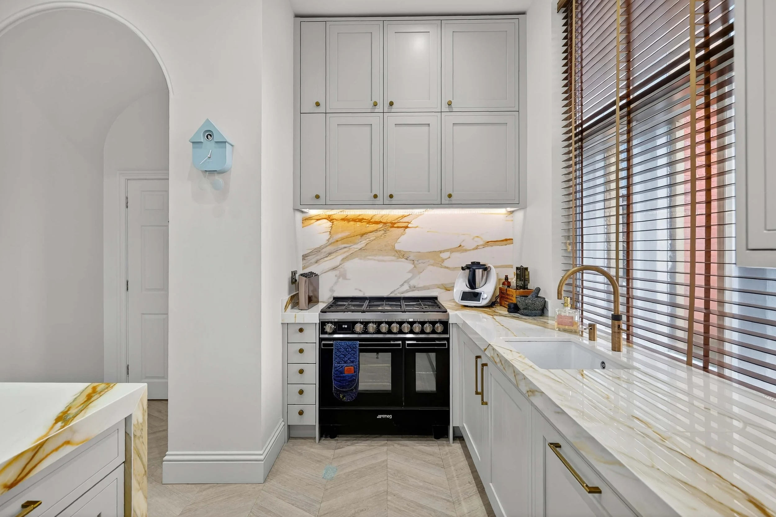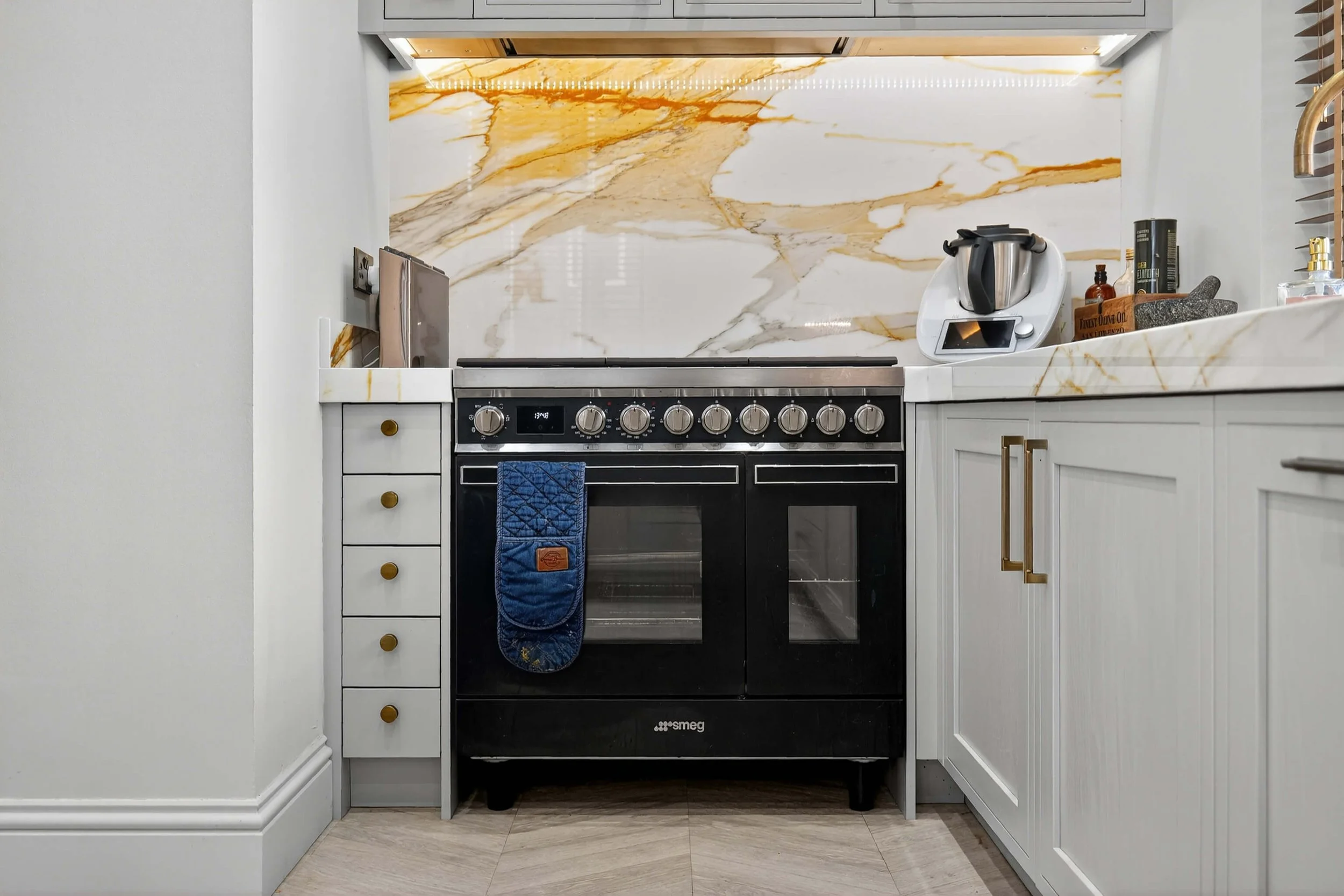 Worktops and splashbacks are in Calacatta Antique, a white surface with elegant gold veining that adds subtle luxury and visual interest. This natural-effect finish enhances the traditional feel of the kitchen while offering durability for everyday use.