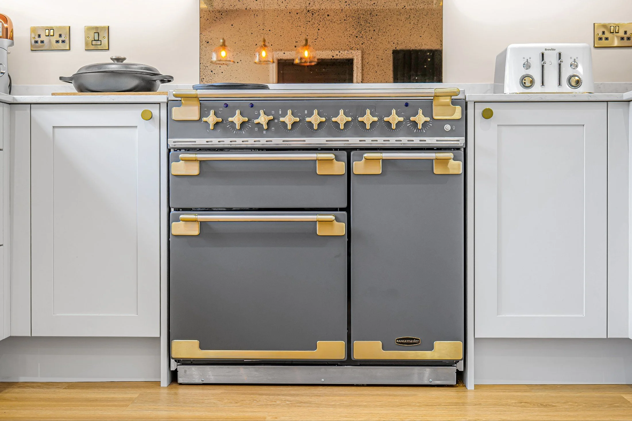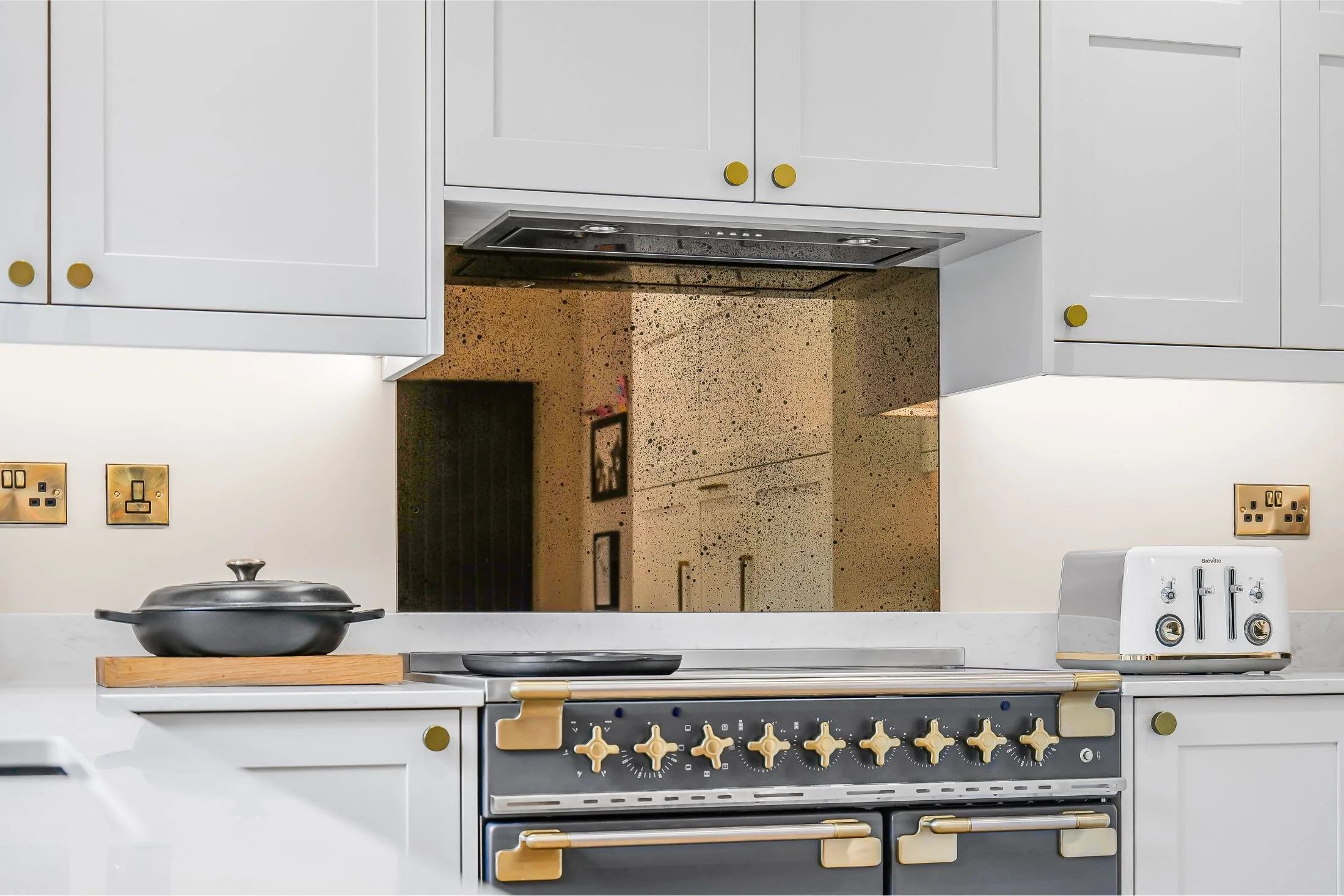 Ocean White quartz worktops create a clean and refined look, while an antique mirror glass splashback adds depth and a subtle touch of luxury.