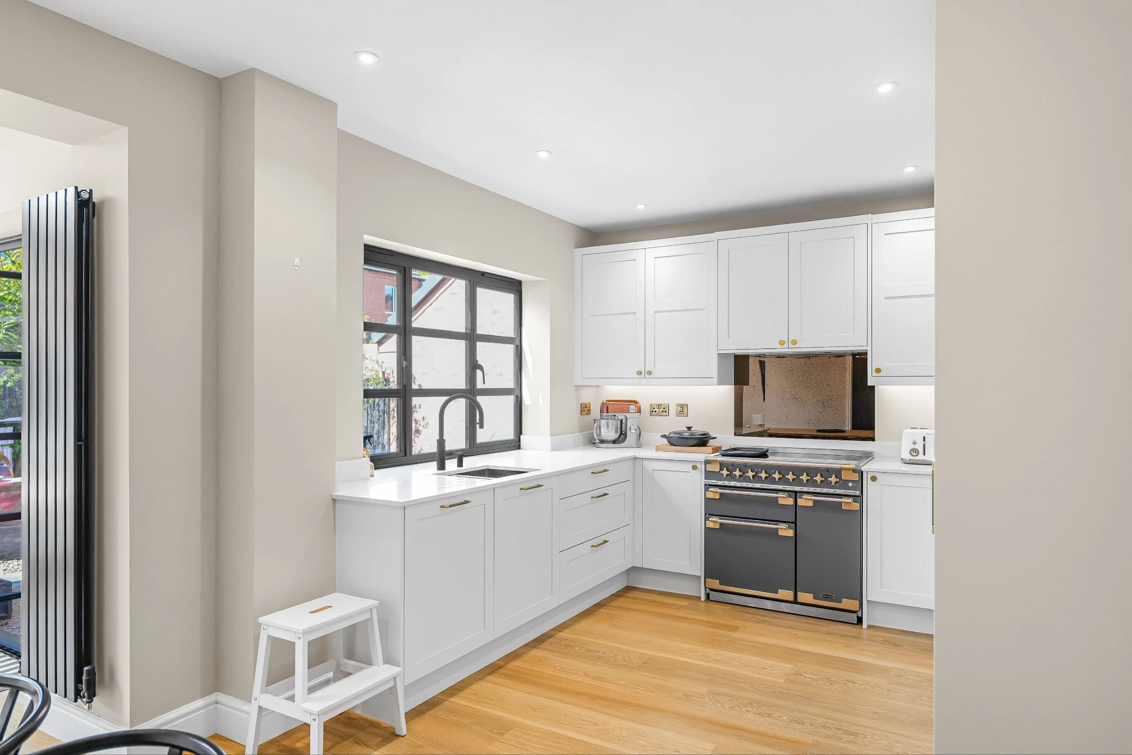 Appliances from NEFF and Rangemaster have been carefully selected to suit the needs of a busy household. Meanwhile, a painted brass Quooker tap with matching soap dispenser brings modern convenience with a traditional twist.